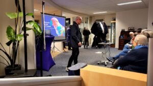 Na de pauze wist docent Donners ons direct weer bij de les te krijgen. Leuk was het om te zien hoe AI de groepsfoto van alle Vreugdenhil-personeelsleden tot leven wist te brengen. Of hoe AI kan ondersteunen om als zzp-er belastingaangifte te doen. Maar je moet zijn bevindingen wel controleren op juistheid en dus belde hij voor de zekerheid nog even met de belastingdienst om te checken of de aanbevelingen wel klopten. ‘U kunt natuurlijk ook gewoon naar Kantoor Vreugdenhil gaan voor uw aangifte’, was een rake constatering vanuit de zaal.